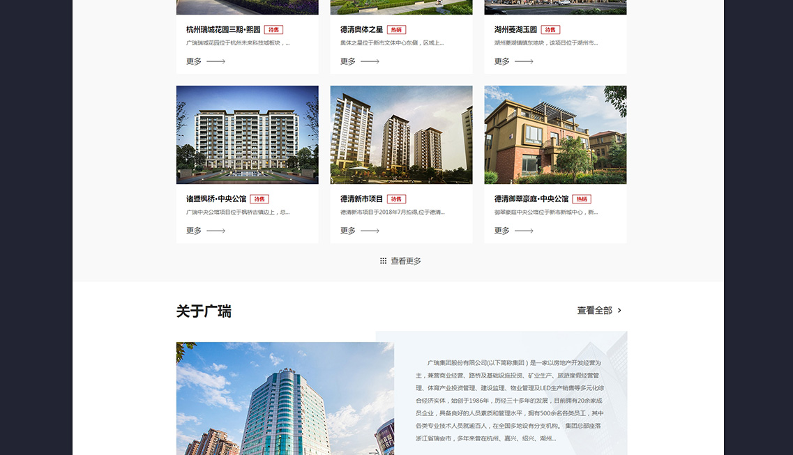 廣瑞集團股份有限公司(以下簡稱集團)是一家以房地產開發經營為主,兼營商業經營、路橋及基礎設施投資、礦業生產、旅游度假經營管理、體育產業投資管理、建設監理、物業管理及LED生產銷售等多元化綜合經濟實體,始創于1986年,歷經三十多年的發展,目前擁有20余家成員企業,具備良好的人員素質和管理水平,擁有500余名各類員工,其中各類專業技術人員就逾百人,在全國多地設有分支機構。 集團總部座落浙江省瑞安市,多年來曾在杭州、嘉興、紹興、湖州、上海、桂林、呼和浩特、昆明、遼寧阜新、貴州黔西南州、澳大利亞墨爾本等地設立分支機構,并在當地進行開發、經營、生產、管理。