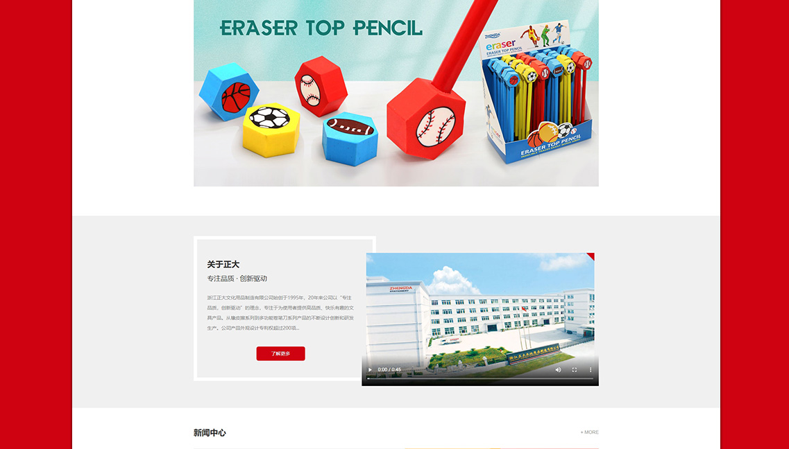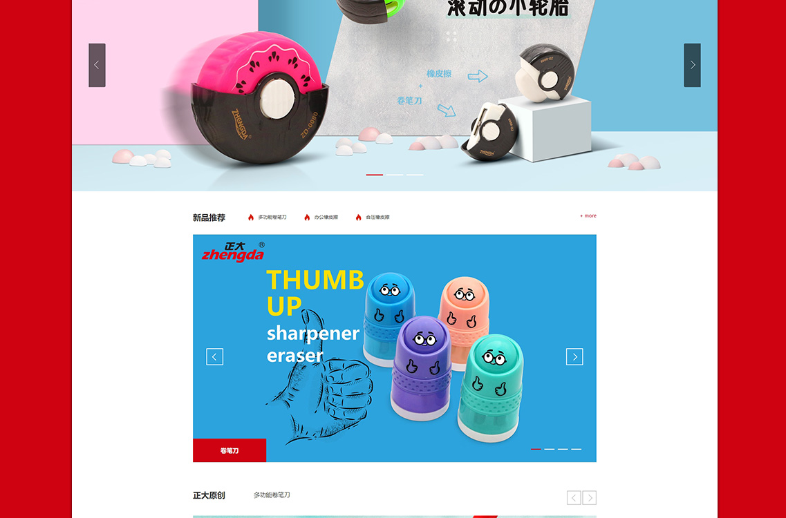 浙江正大文化用品制造有限公司始創(chuàng)于1995年,20年來(lái)公司以“專注品質(zhì),創(chuàng)新驅(qū)動(dòng)”的理念,專注于為使用者提供高品質(zhì)、快樂(lè)有趣的文具產(chǎn)品。從橡皮擦系列到多功能卷筆刀系列產(chǎn)品的不斷設(shè)計(jì)創(chuàng)新和研發(fā)生產(chǎn)。公司產(chǎn)品外觀設(shè)計(jì)專利權(quán)超過(guò)200項(xiàng);在2003年順利通過(guò)了Iso9002、歐洲en71、美國(guó)Astm認(rèn)證。在中國(guó)文具制造業(yè)中享有生產(chǎn)的榮譽(yù)。