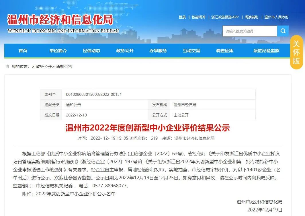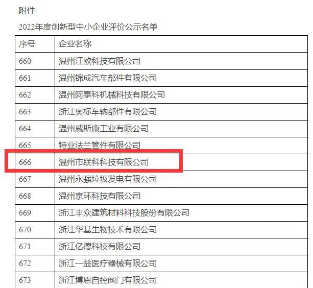 根據(jù)溫州市經(jīng)濟和信息化局于2022年12月19日發(fā)布的《溫州市2022年度創(chuàng)新型中小企業(yè)評價結果公示》顯示,溫州市聯(lián)科科技有限公司成功入選2022年度溫州市創(chuàng)新型中小企業(yè)名單。