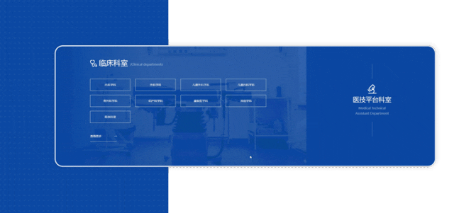 為了讓患者更好地了解醫(yī)院各個科室的特點和優(yōu)勢,我們需要設(shè)計科室介紹的板塊。在設(shè)計中,我們使用背景圖片來展示科室的特點和設(shè)施情況。同時還可以設(shè)置互動環(huán)節(jié),其中兩大科室的來回切換,可以讓患者快捷使用和清楚知曉科室的所屬,讓患者更好地了解各個科室的情況。
