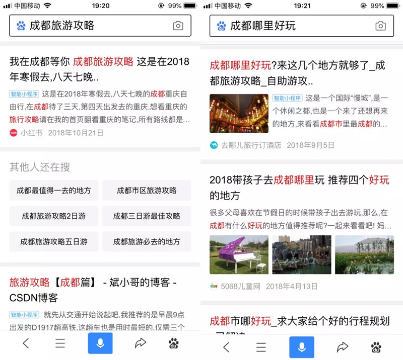 長(zhǎng)尾詞搜索示例:用戶搜索“成都旅游攻略”“成都哪里好玩”等關(guān)鍵詞,小紅書(shū)和去哪兒旅行的相關(guān)內(nèi)容都會(huì)以智能小程序的方式出現(xiàn),并會(huì)通過(guò)醒目的“智能小程序”標(biāo)記提醒用戶。