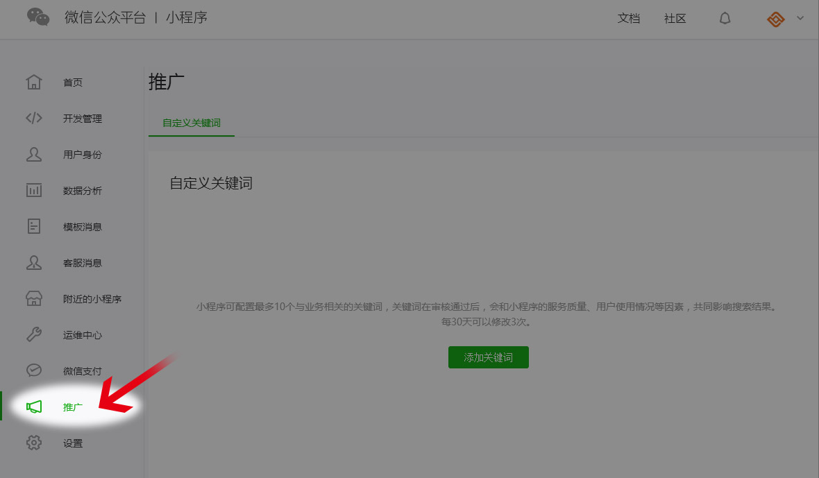 可在小程序后臺的 “推廣” 模塊中,查看通過自定義關鍵詞帶來的訪問次數。