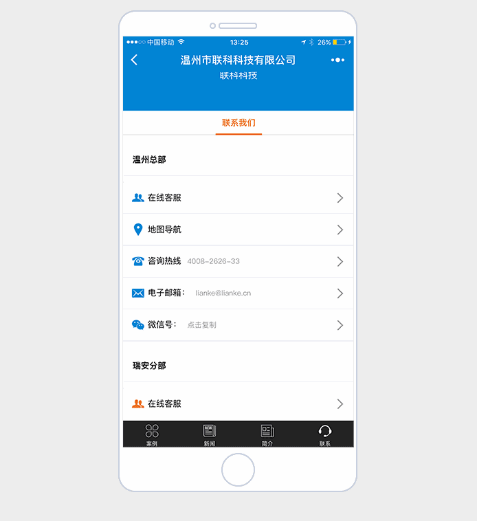 在聯系我們欄目中點擊“微信號”按鈕,快速復制微信號,完成添加微信好友的功能,達到瀏覽者于企業平臺之間的直接對接,提高營銷精準度與好感度;