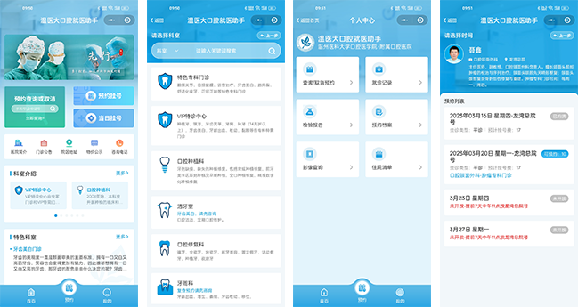 為溫醫大附屬口腔醫院開發的微信小程序應用,根據需求進行整體UI設計,呈現更好地視覺效果,優化患者預約、查詢等功能的用戶體驗。包括預約掛號、當日掛號、科室介紹、物價公示、專家介紹、查詢就診記錄、體檢報告、醫療影像、住院清單等功能,助力醫院更好服務患者。